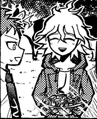 アイランドモードで狛枝に採取をお願いしたらめっちゃ金の卵とれてビックリする日向クンのイラスト。