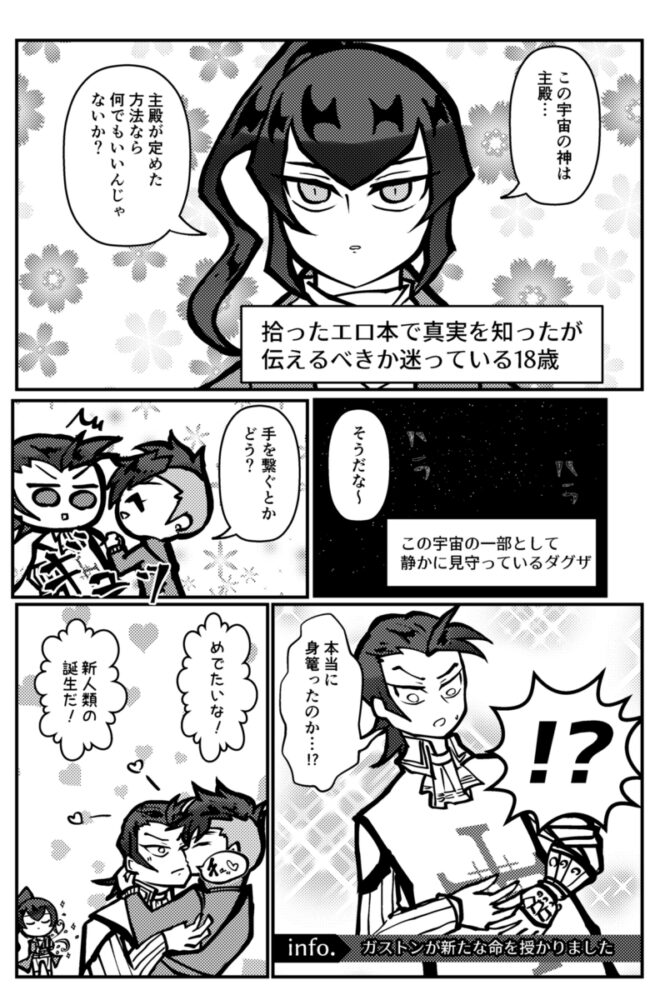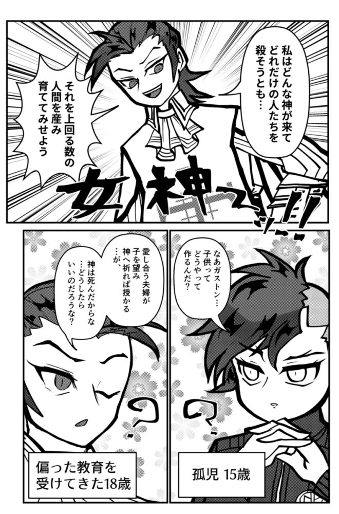 初めての皆殺しルートの女神はガストンにしました。殺した時に罵倒してくれたガストンなので女神にしたらさぞかし嫌がられるだろう……と思ったらみんなを裏切った俺を肯定しただ受け入れるだけの、俺の知ってるガストンじゃない「何か」がそこにいた。これはこれで好きです♪