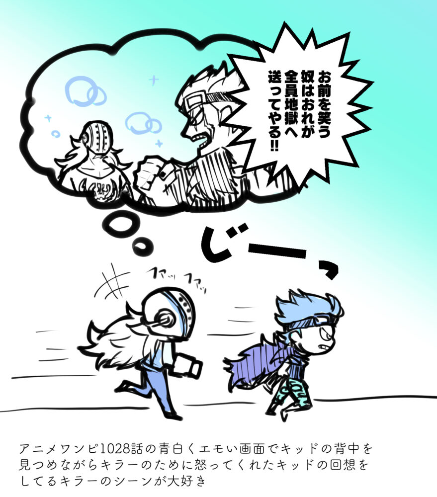 アニメワンピ1028話のしっとりとしたBGMが流れながらエモい雰囲気でキラーが前を走るキッドを見つめるシーン幻覚かと思った。ワンピのアニメは原作に追いついちゃってるからか、盛れそうなエピソードは盛り盛りにしてくれて嬉しい…原作では1コマで終わったキラーがオロチにSMILE渡される回想がアニメだと盛られて、キラーがキッドを救える可能性をチラつかされて即仮面を取ってSMILE食べていた所も好き。