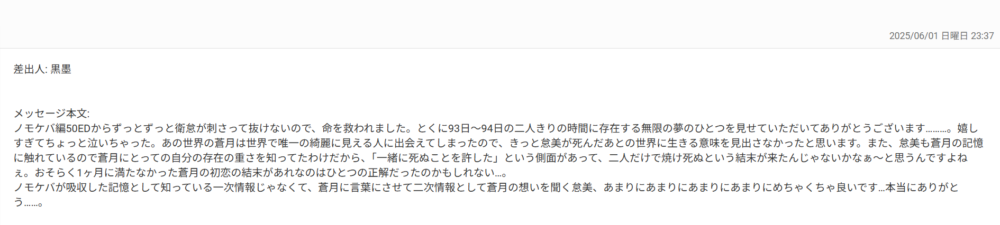 蒼月って他ルート見るに他者を思い遣る気持ちみたいな美徳が好きだから、怠美が綺麗に見えるだけでも好きだったのに拓海や死んだ第二メンバーへの献身を知って内面まで美しくて怠美のこと大好きになっちゃったんだろうなと思います。ノモケバ化後は怠美の優しい本心も知ってもう大大大大好きですよきっと。